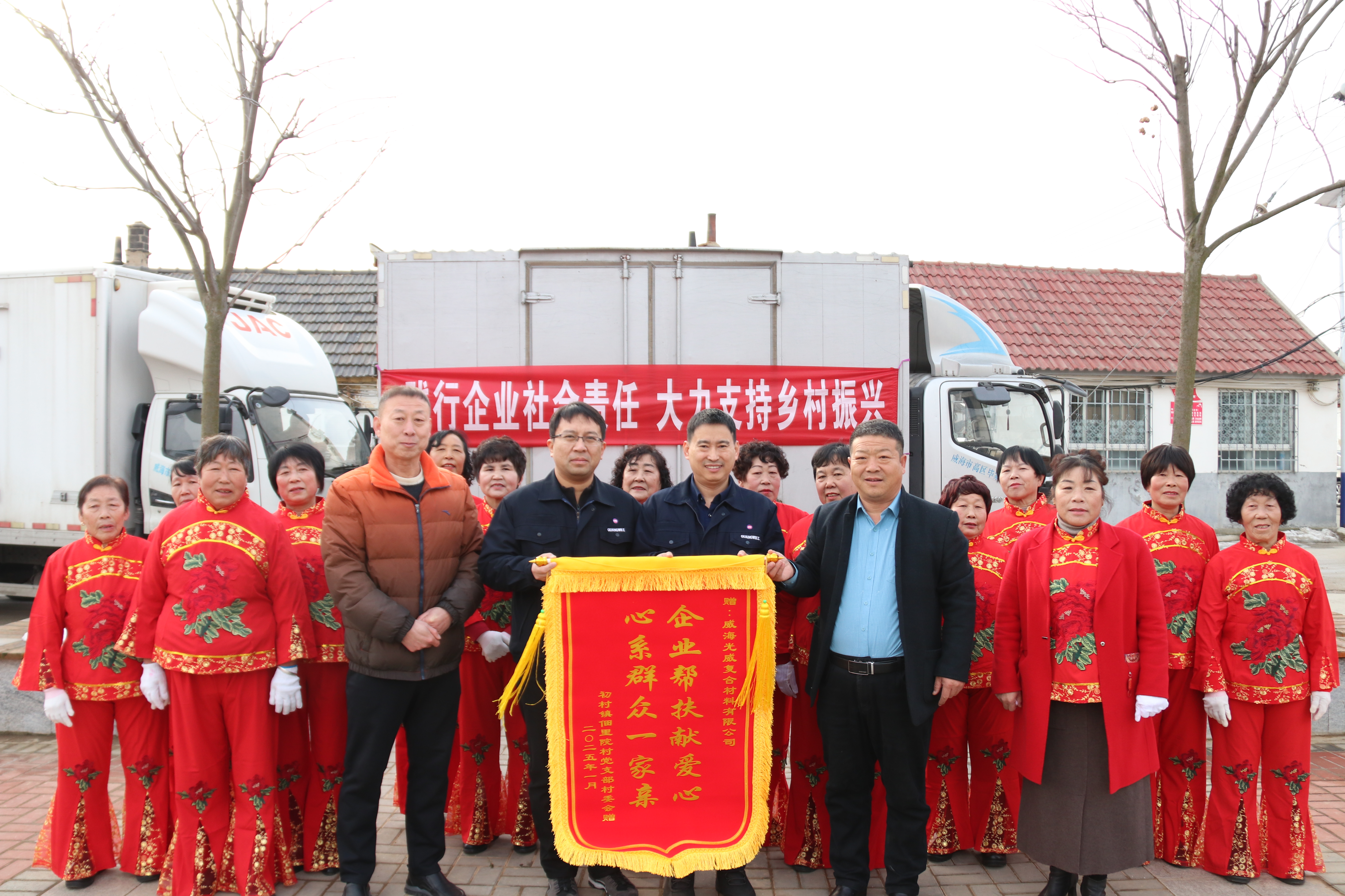 1月22日,受太阳成集团tyc7111党委书记委托,行政党支部书记林凤森带队走进威海市佃里院村,为村民们献上年货与诚挚祝福。此次慰问,公司准备了375袋大米、375箱排骨和肉类组合套装。为感谢公司,村民们送上锦旗,“企业帮扶献…